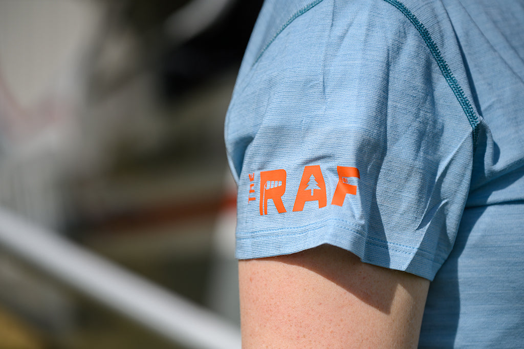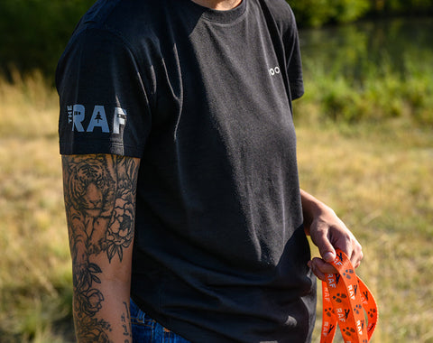 This tee comes in a light blue color with an orange RAF logo or a black color with a gray RAF logo. The RAF logo is featured on the sleeve.