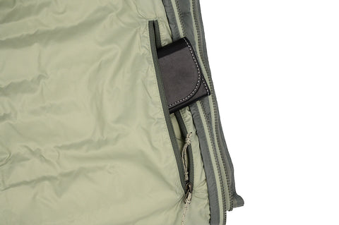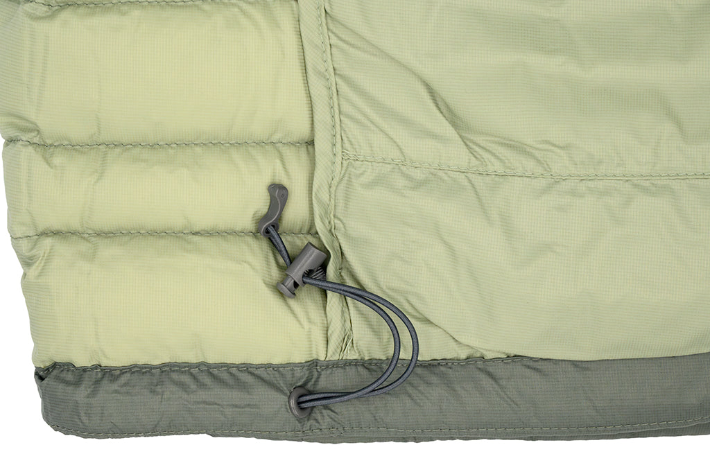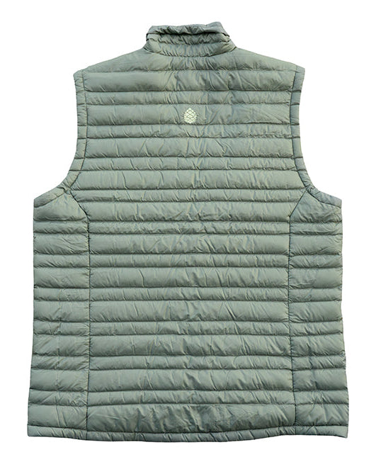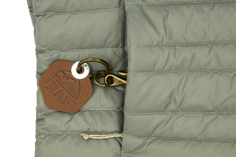 The Stio Pinion down vest has lightweight, 800-fill RDS-certified down insulation, offering excellent wind resistance and water repellency. It's made for everyday and active four-season warmth. It has an interior security pocket that doubles as a stuff pocket. It's a light green/grey color, featuring a grey RAF logo on the front.
